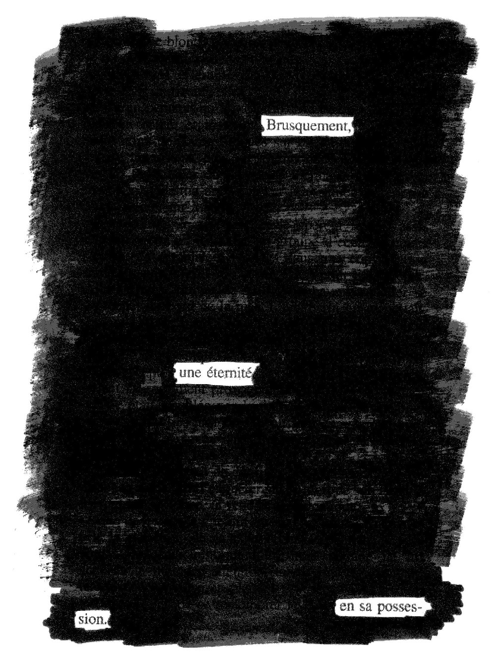 Un autre poème black out. Toujours des textes courts, évidemment, qui me font penser aux haikus et aussi à « Cent phrases pour éventail », de Claudel.